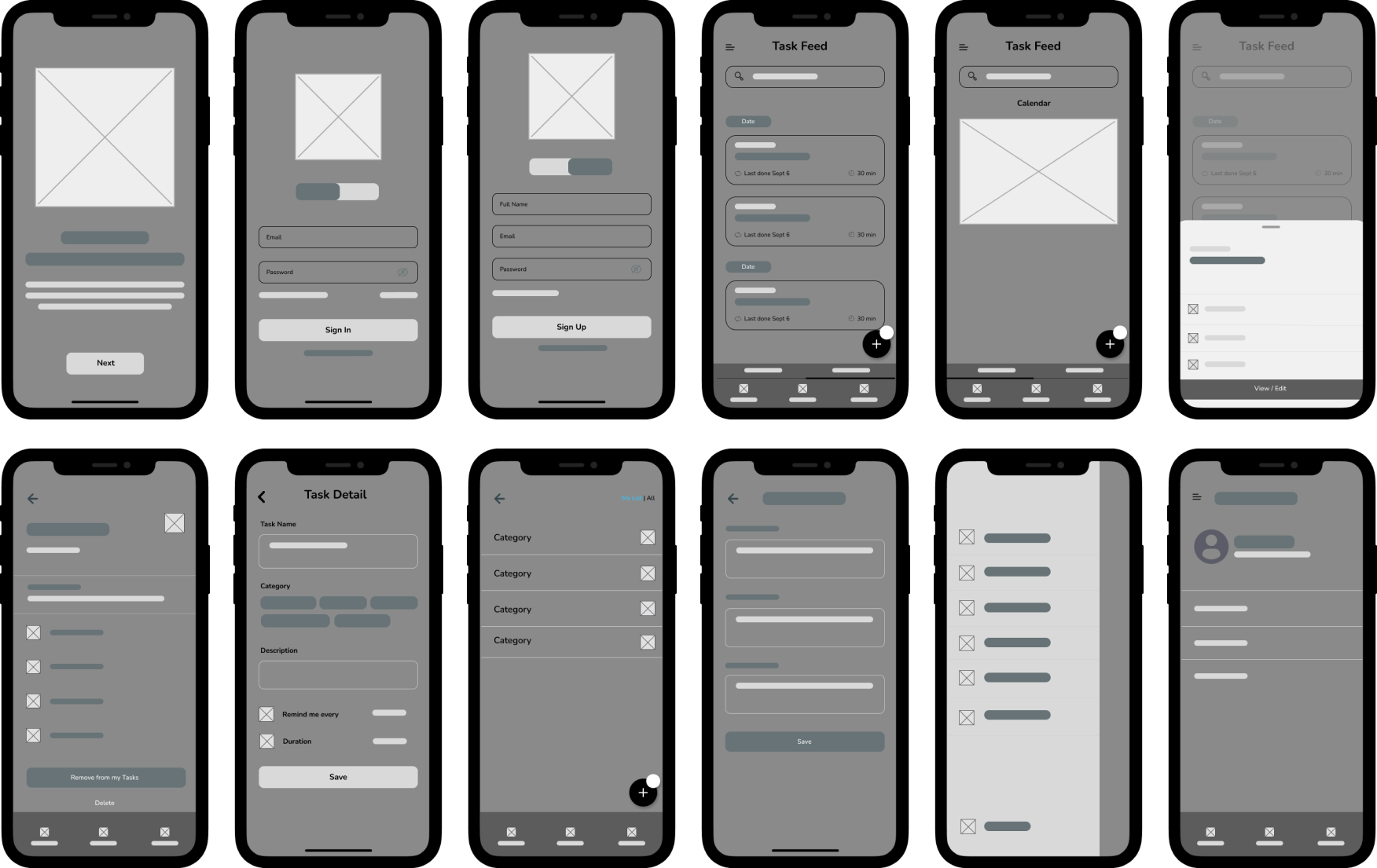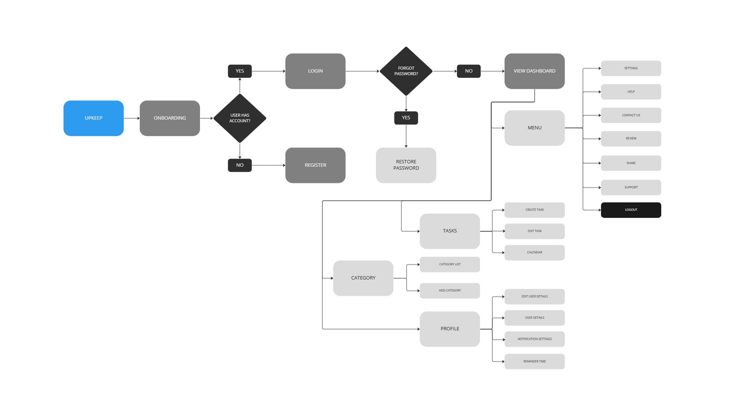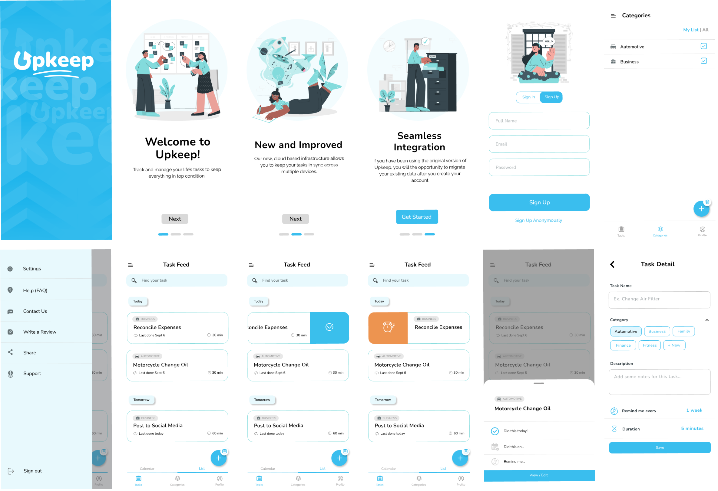 These low-fidelity wireframes for Upkeep provide a demonstration of the information hierarchy for the mobile app. The wireframes aim to ensure that the app is intuitive and easy to use, with a focus on providing an optimal user experience.